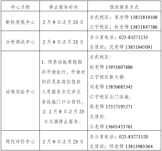根据药大办〔2026〕1号 关于2026年放寒假的通知精神,现将中国药科大学公共实验平台2026年寒假期间有关工作安排通知如下: